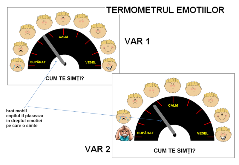 PLANSA LAMINATA “TERMOMETRUL EMOTIILOR” 1 PLANSA LAMINATA CU O SCALA A EMOTIILOR SI CU UN BRAT MOBIL PE CARE COPILUL TREBUIE SA IL POZITIONEZE IN DREPTUL EMOTIEI PE CARE O RESIMTE Pret : 30 RON